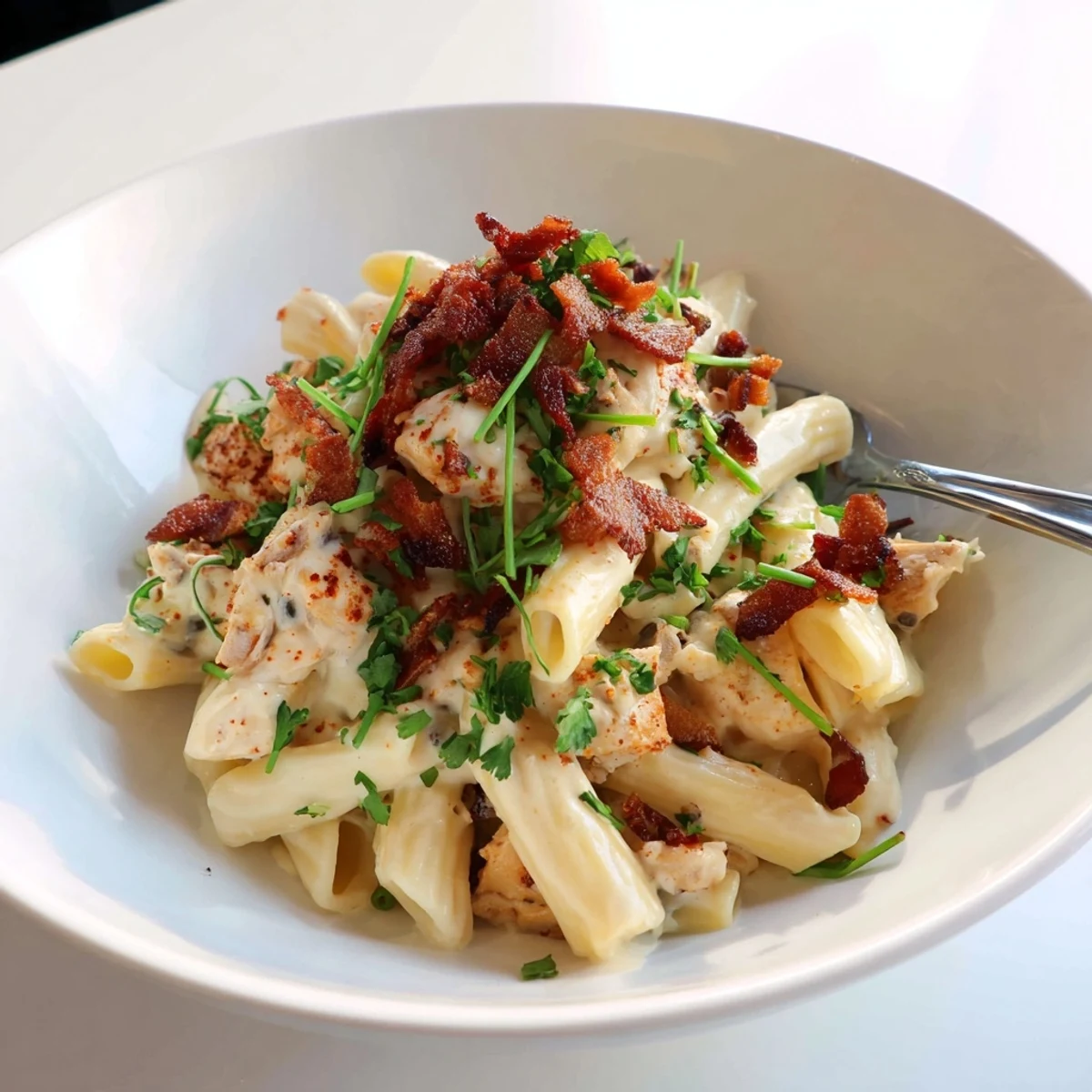 Indulge in this decadent pasta featuring golden chicken breast pieces seasoned with smoked paprika and garlic, swimming in a velvety sauce made from cream cheese, sharp cheddar, and heavy cream. The crispy beef bacon adds savory crunch while fresh parsley, chives, and spring onions bring brightness. Ready in under an hour, this American-style comfort dish serves four generously and pairs wonderfully with a crisp green salad.