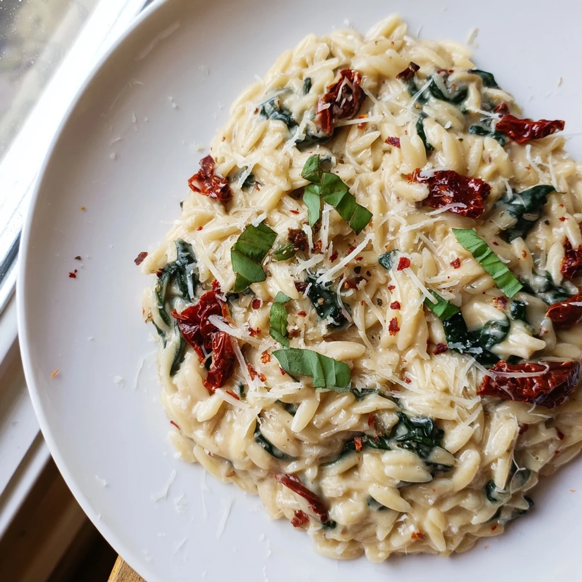 This satisfying one-skillet pasta features tender orzo cooked directly in vegetable broth with sun-dried tomatoes, creating a base for a luxurious cream sauce. Fresh spinach wilts into the dish, adding vibrant color and nutrients, while freshly grated Parmesan brings a savory finish. Dried thyme and optional chili flakes provide subtle herb and heat notes that complement the rich flavors. The entire dish comes together in just 30 minutes, making it perfect for busy weeknights yet elegant enough for casual entertaining.