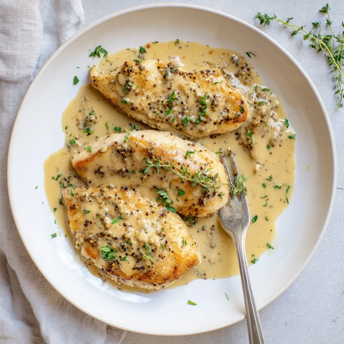 The combination of Dijon and whole-grain mustard creates depth and texture, while white wine deglazes the pan to incorporate caramelized bits. Heavy cream and fresh thyme deliver that classic French velvety finish.