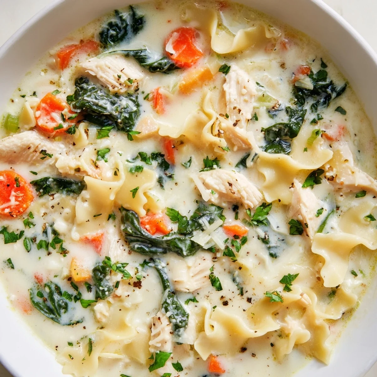 This rich, satisfying soup captures all the comforting flavors of classic white lasagna in an easy one-pot format. Tender pieces of chicken simmer alongside broken lasagna noodles in a fragrant broth, while fresh spinach adds color and nutrition. The finishing touch comes from a luxurious blend of ricotta, mozzarella, and Parmesan that melts into the hot broth, creating a velvety, cheesy texture. With aromatics like onion, garlic, carrots, and celery, plus Italian herbs and a hint of red pepper flakes, this soup delivers layers of flavor in every spoonful.