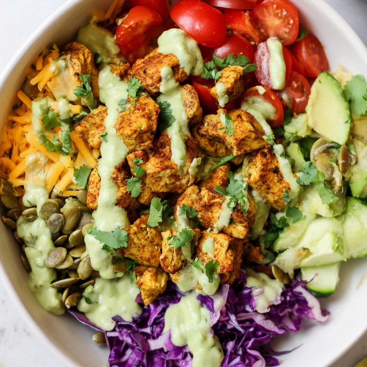 These customizable keto bowls combine seasoned grilled chicken with a colorful array of fresh vegetables including romaine lettuce, cucumber, bell peppers, cherry tomatoes, and red cabbage. The star of the dish is a luscious avocado dressing made with ripe avocado, Greek yogurt, lime juice, and garlic. Each bowl is topped with shredded cheese, roasted pumpkin seeds, and fresh cilantro for added texture and flavor.