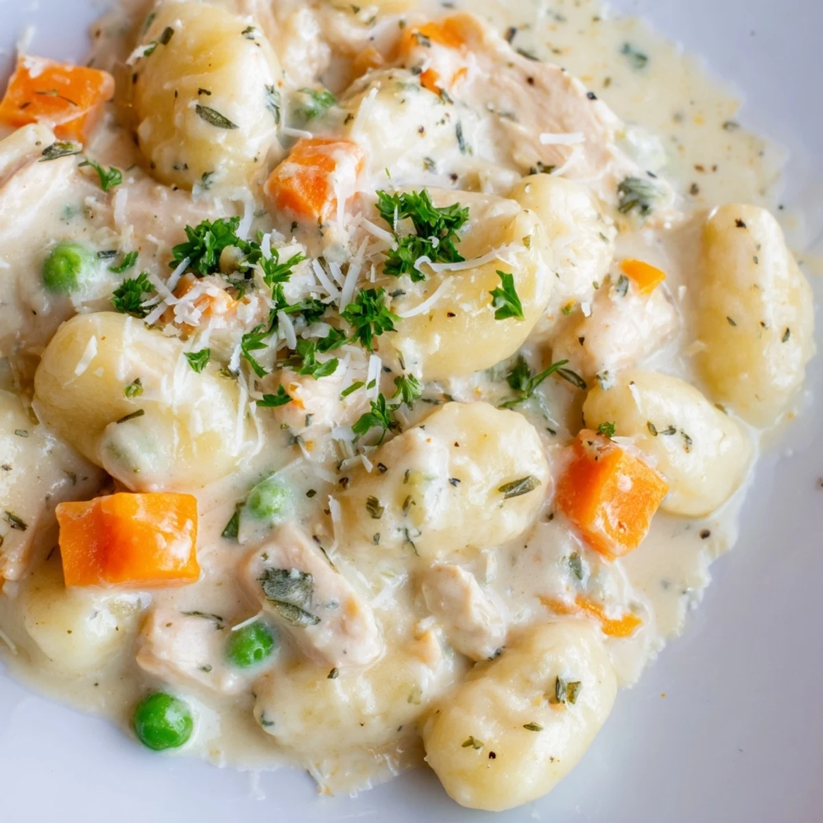 This hearty one-pot dinner combines tender shredded chicken with soft potato gnocchi, classic vegetables like carrots, celery, and peas, all nestled in a rich, creamy sauce seasoned with thyme and sage. The entire dish cooks together in a single skillet, allowing the gnocchi to absorb the savory flavors while the sauce thickens to perfection. Ready in just 45 minutes, this comforting meal serves four and requires minimal cleanup, making it perfect for busy weeknights or cozy family dinners.