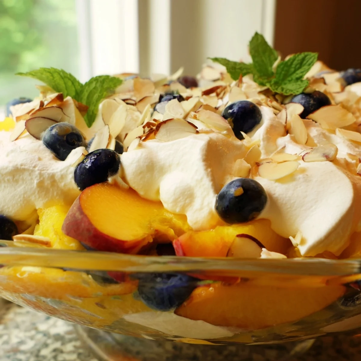 Layer fresh sliced peaches—optionally enhanced with colorful blueberries—then top with cloud-like whipped cream flavored with vanilla and a touch of powdered sugar. A garnish of fresh mint leaves adds brightness, while sliced almonds provide delightful crunch.