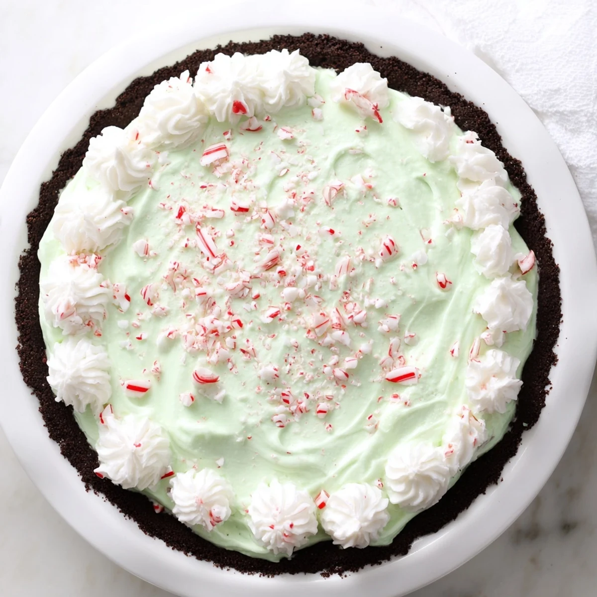 This dessert features a smooth peppermint-flavored cream filling set within a crisp chocolate cookie crust. The filling, thickened with milk, cream, and egg yolks, balances sweetness and a hint of mint, offering a refreshing and cool treat. Once chilled and set, it is topped with softly whipped cream lightly sweetened and garnished with crushed peppermint candies to enhance the festive taste. Ideal for holiday gatherings or whenever a minty dessert craving arises.