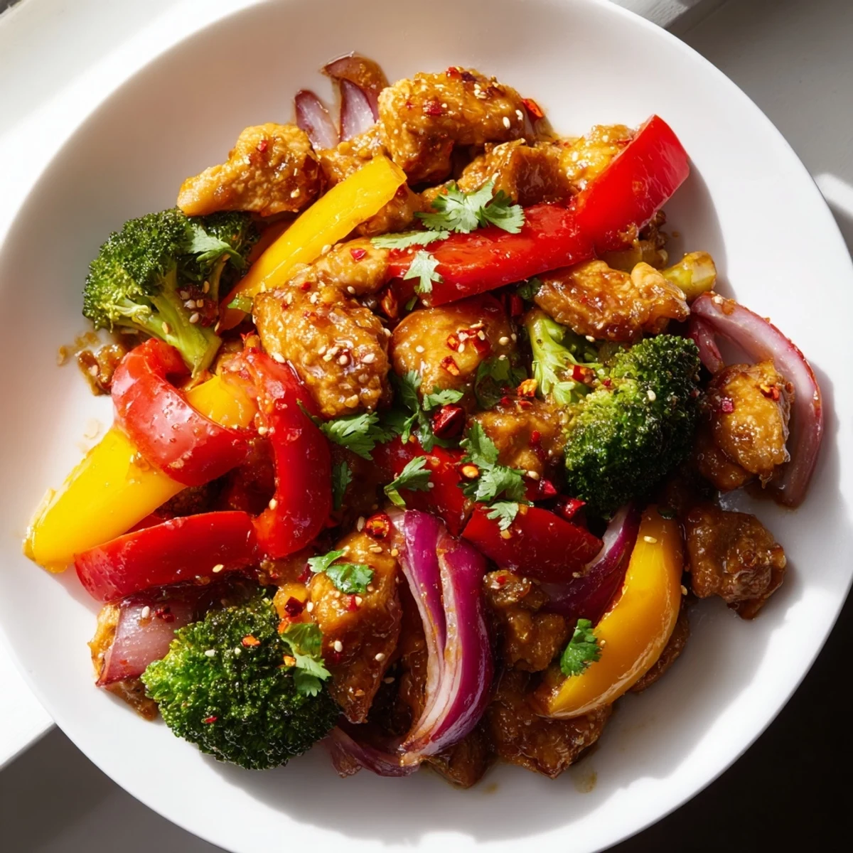 Tender chicken thighs (or tofu for vegetarian option) are pan-seared until golden, then combined with colorful bell peppers, broccoli, and aromatic garlic and ginger. The sweet and savory sauce brings everything together with soy sauce, honey, and a hint of chili flakes for warmth.