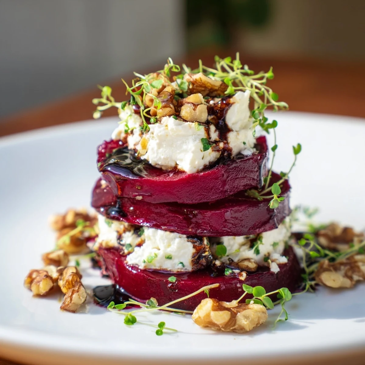 Golden beets make the stacks less messy and add a sunny color that looks gorgeous next to the red, and you can roast both kinds together for a mix. For a vegan version, swap the goat cheese for a plant-based cashew spread mixed with nutritional yeast and lemon juice. I have also added a thin slice of orange between the layers, and the citrus brightened everything in a way I did not expect.