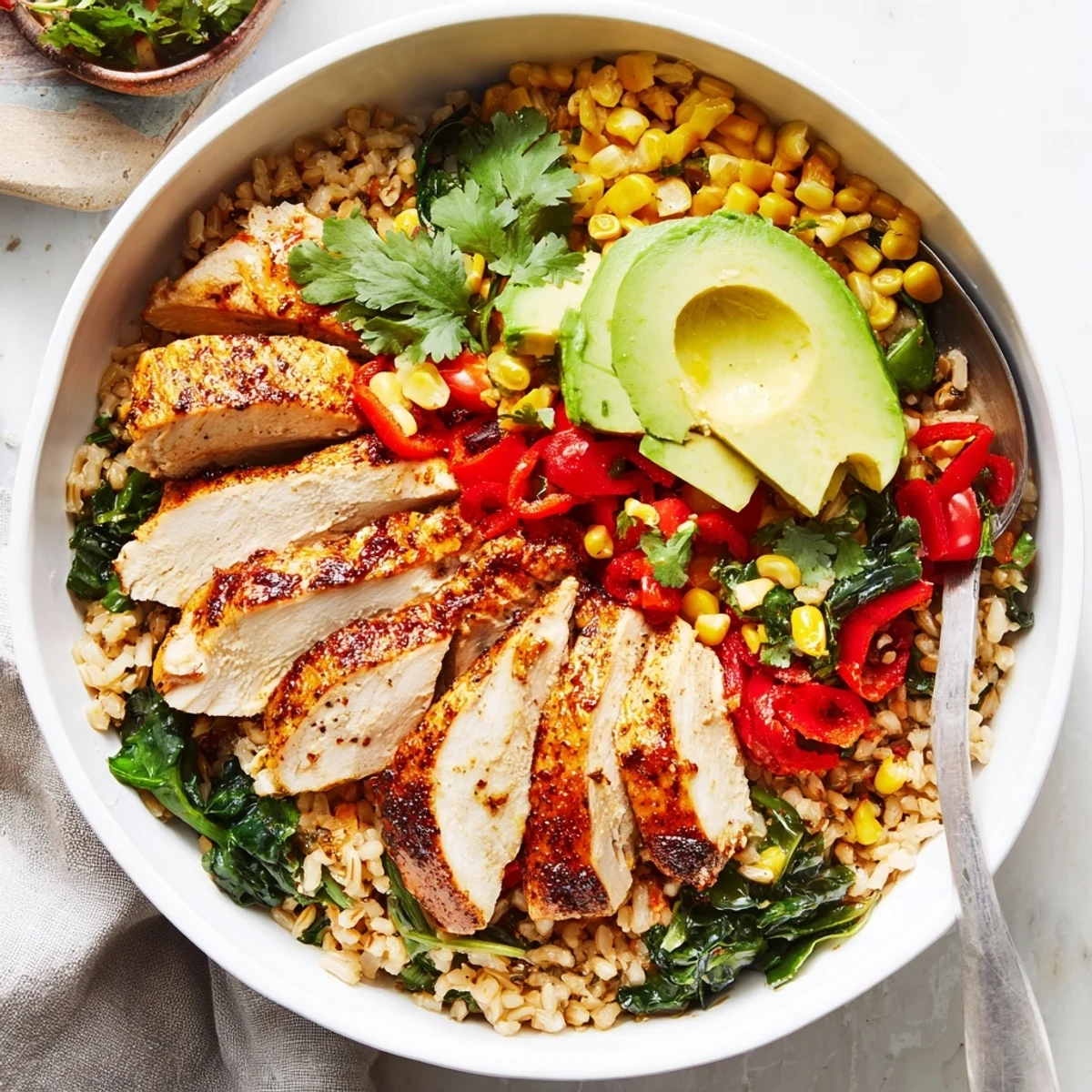 This satisfying Southwest-inspired bowl brings together tender spiced chicken, smoky roasted green chiles, sweet corn, and fresh vegetables in a hearty, nutritious meal. The combination of chili powder, cumin, and smoked paprika creates authentic Southwestern flavors while keeping preparation simple. Ready in under an hour, this versatile dish works perfectly for weeknight dinners or meal prep, offering a balanced mix of protein, vegetables, and wholesome grains.